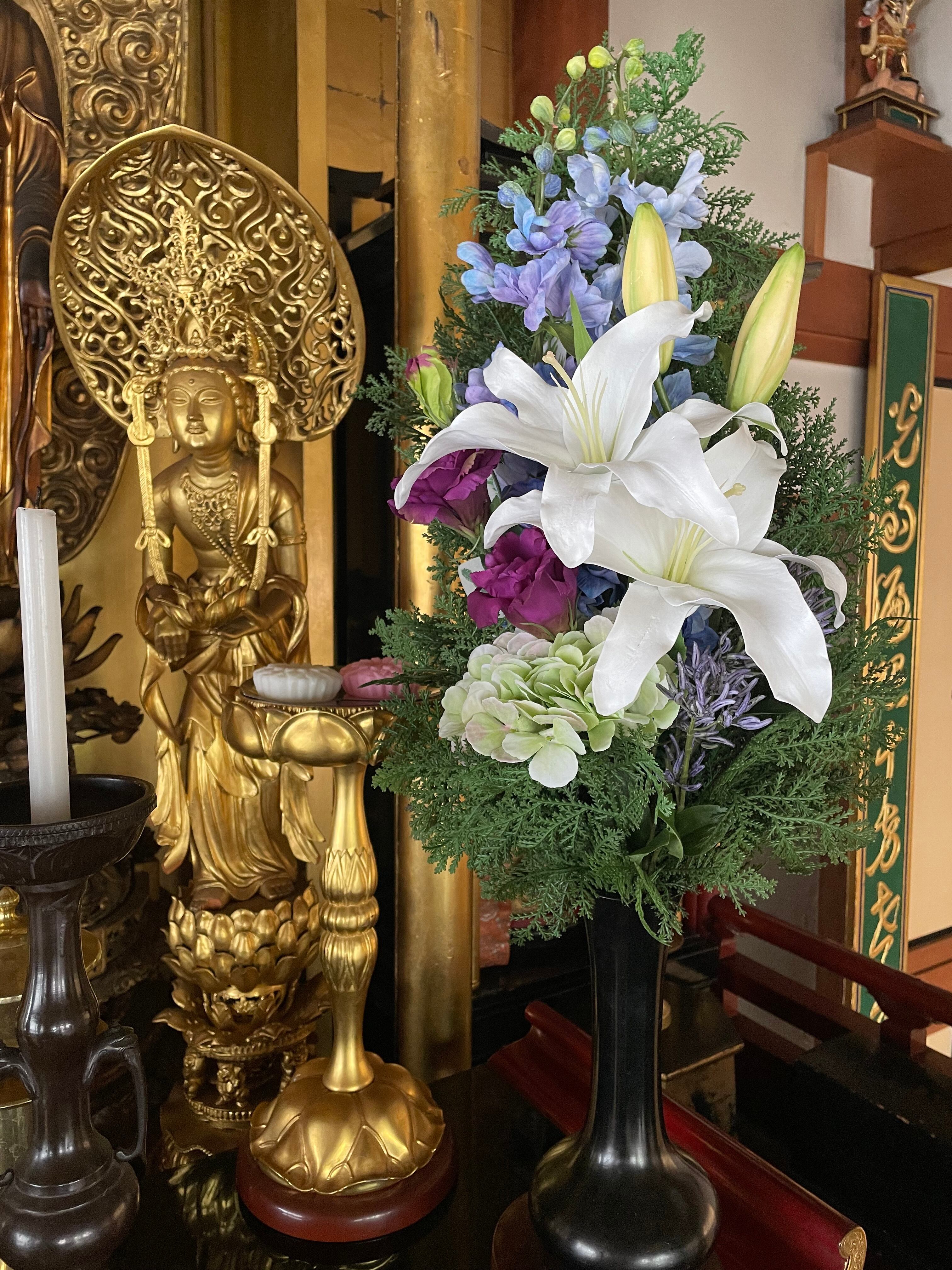 法要のある時などは普段どおり生花をお供えし、参拝のない時や水換えやお花の交換があまりに頻繁になる夏などはアーティフィシャルフラワー(造花)を取り入れる、、、