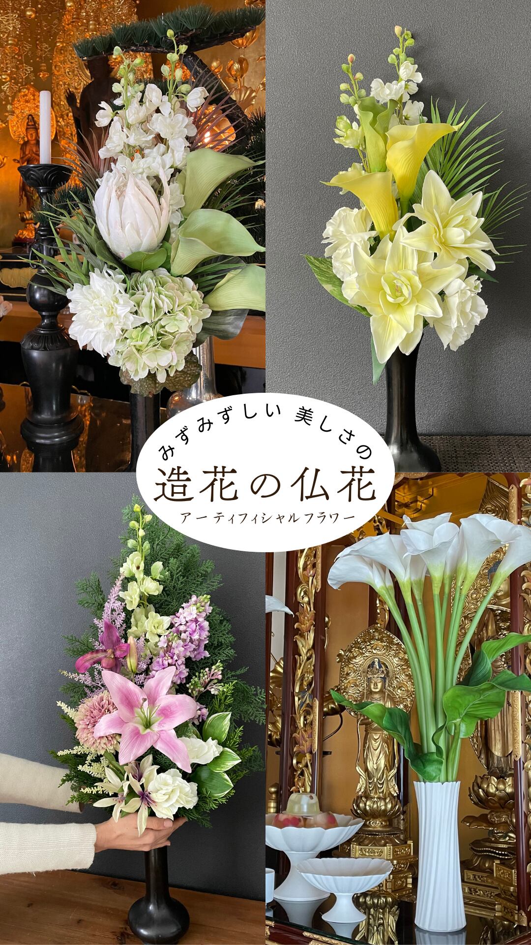 まるで生花のようにリアルで美しく精巧に作られた高品質な造花です。間近で見ても生花にしか見えない美しさです。当店ではその中でも上質なものだけを厳選して使用し、細部まで美しさにこだわってお作りしております。 アーティフィシャルフラワーの造花仏花は、劣化しにくく長持ちし、もちろんお水も不要で手間が要りません。 真夏など、生花を月に何度も交換するよりも大幅なコスト削減になります。